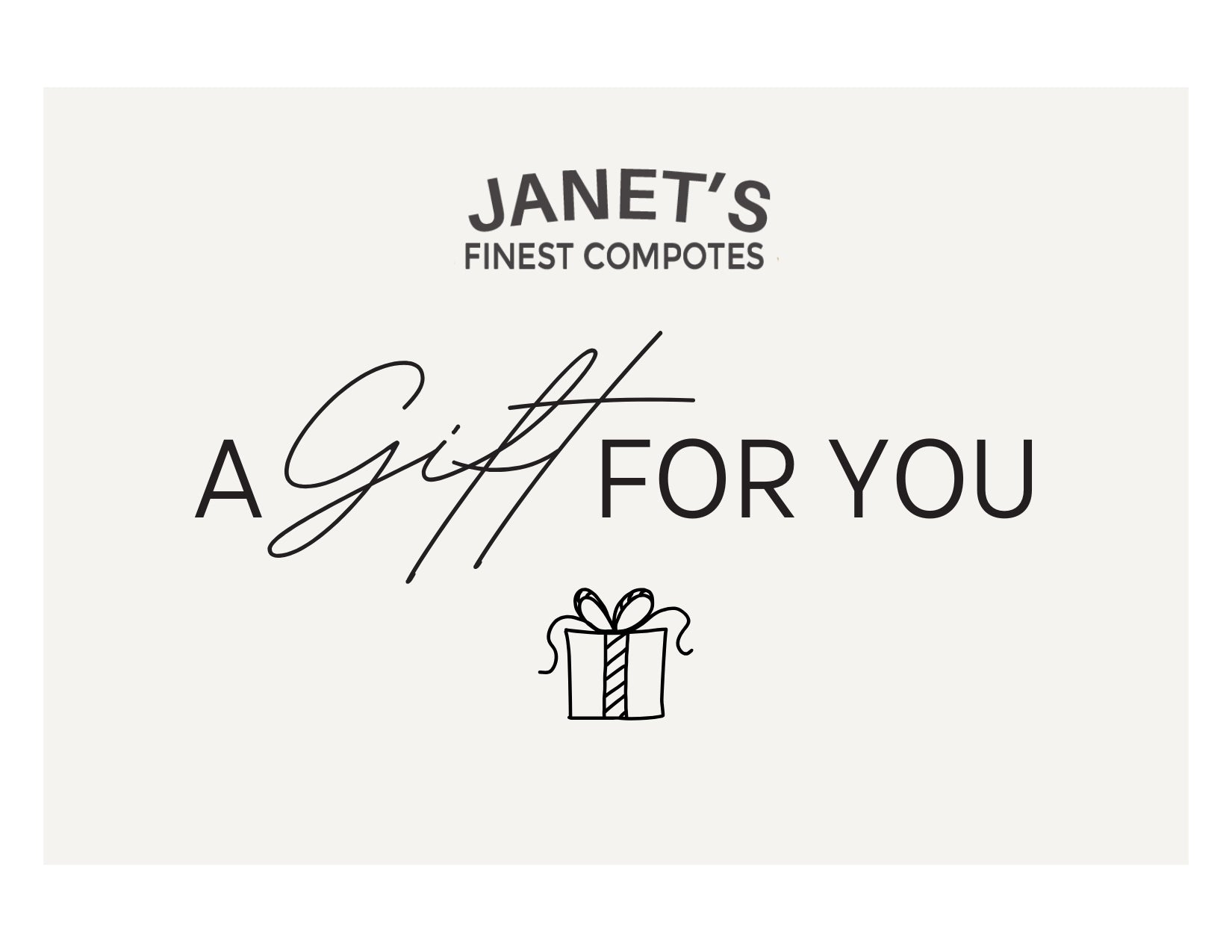 A Janet’s Finest Compotes Gift Card lets them experience our handcrafted compotes—made from vibrant fruit, a hint of heat, and a whole lot of love. Delivered by email and ready to delight any foodie, host, or holiday gift list.