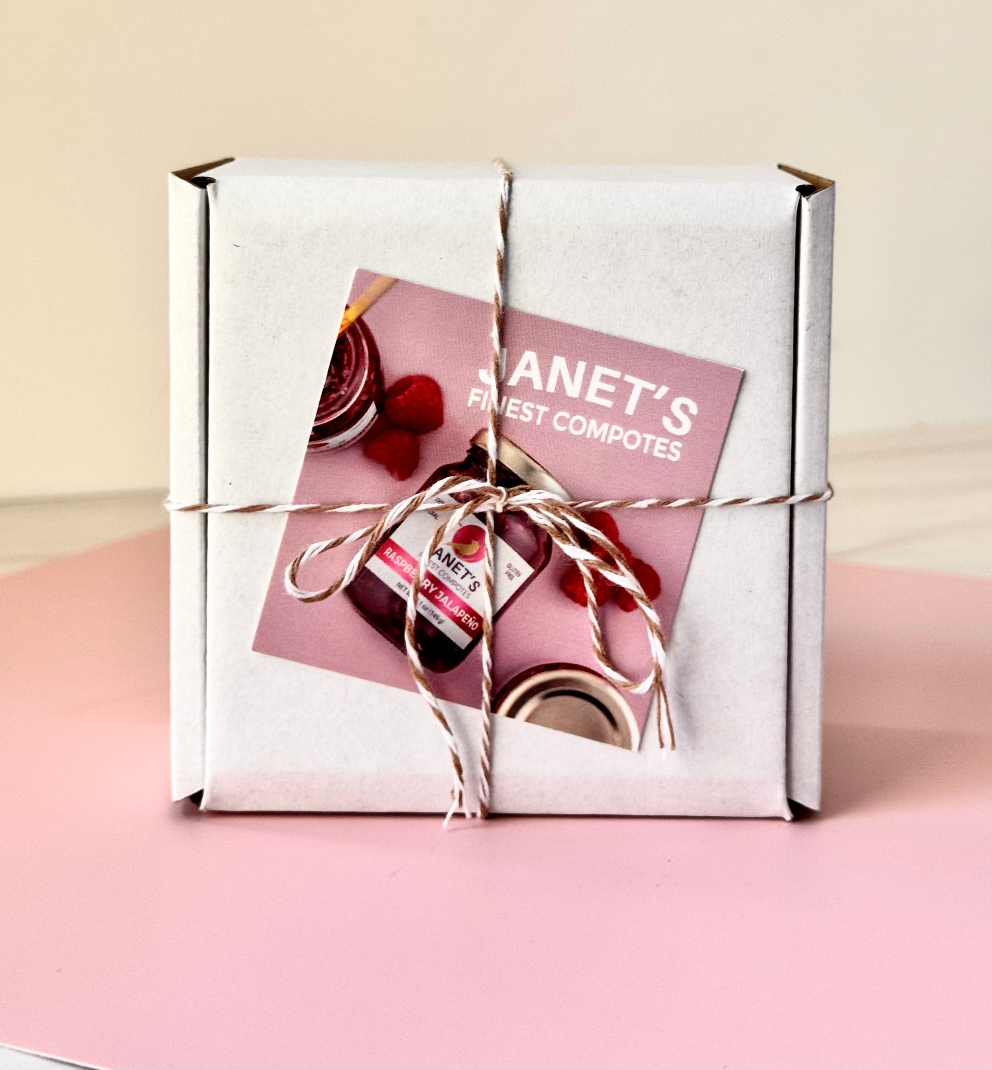 Janet's Finest Compotes Mini Variety Sample Pack offers a delightful tasting experience with four 1.5 oz jars of their signature sweet-and-spicy fruit compotes. Each season brings a fresh selection of flavors crafted to highlight the best of the season. Perfect for cheeseboards, entertaining, or gifting, this sampler brings a gourmet kick to any occasion.